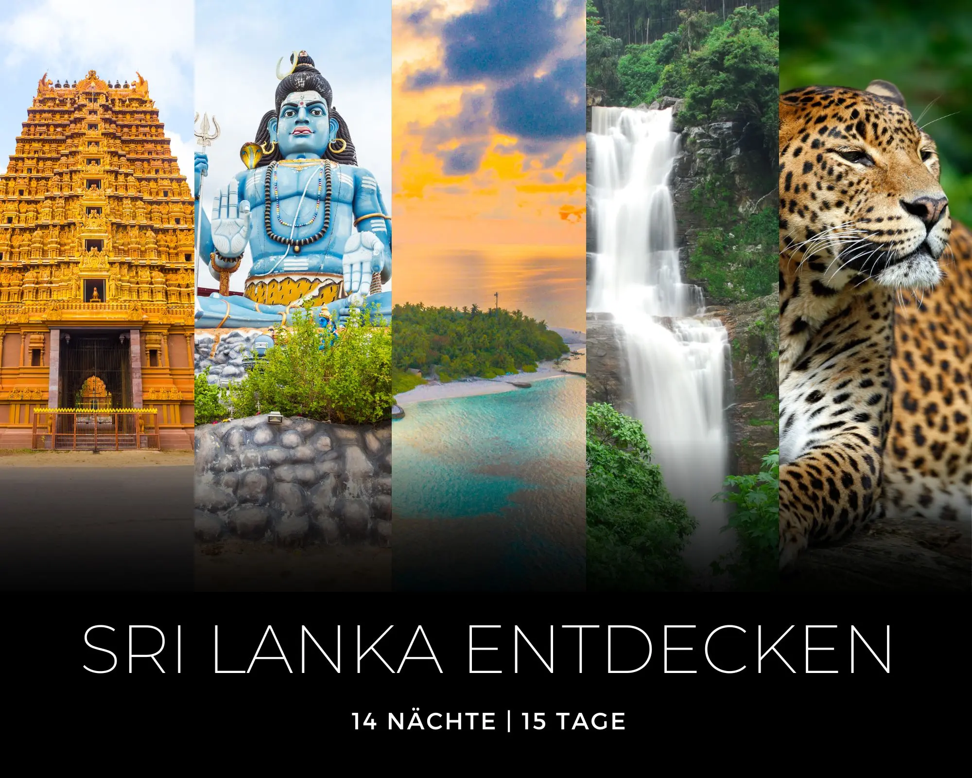 Begeben Sie sich auf die ultimative Reise mit unserer 15-tägigen "Entdecken Sie Sri Lanka" Tour. Dieses umfassende Paket führt Sie zu den bekanntesten Sehenswürdigkeiten und verborgenen Schätzen der Insel. Von antiken Tempeln und üppigen Teeplantagen bis hin zu lebhaften Städten und unberührten Stränden – erleben Sie die vielfältige Schönheit und reiche Kultur Sri Lankas. Jeder Tag bringt neue Abenteuer und unvergessliche Momente, ideal für alle, die alles sehen möchten.